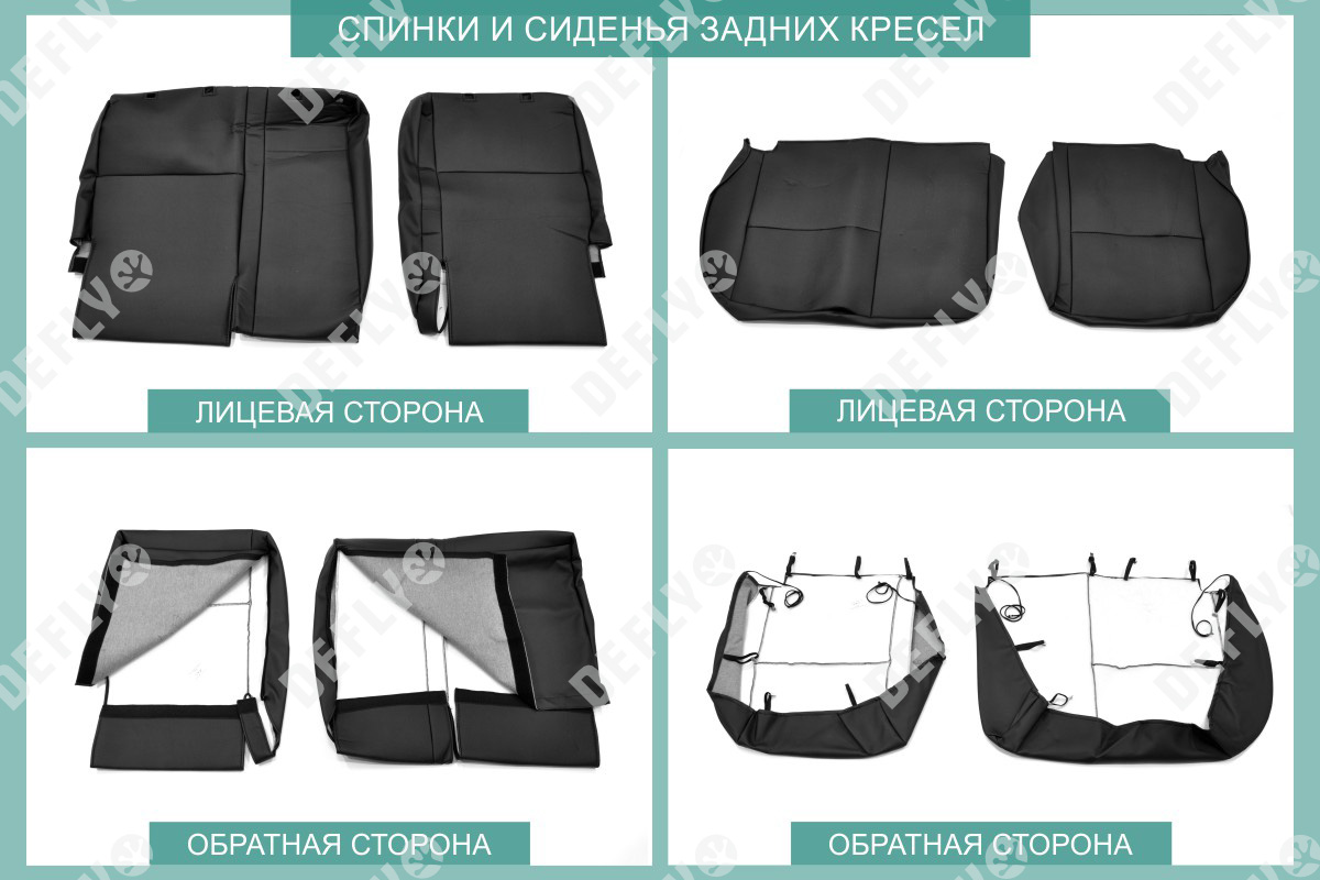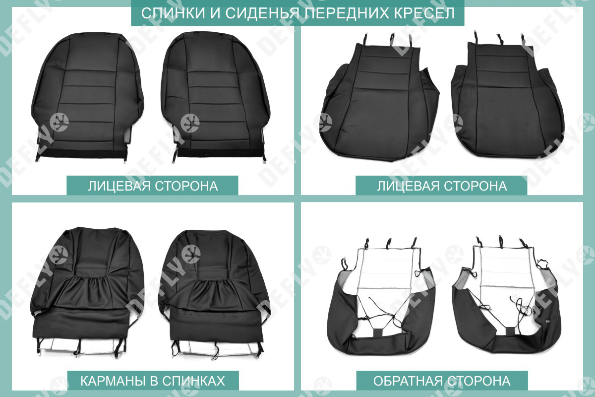Материал: Экокожа гладкая, экокожа перфорированная, Цвет: Черный (оттенок ткани может незначительно отличаться). Модельные чехлы от производителя “Defly” индивидуально сконструированы для каждого автомобиля. Изготовленные по лекалам оригинальных кресел, чехлы гарантируют идеальную посадку. Все швы и технологические отверстия обработаны на оверлоке. Чехлы не ограничивают заводскую функциональность салона. Наличие в чехлах специального распускаемого шва не препятствует своевременному и полному раскрытию подушек безопасности. Специально разработанная система креплений позволяет надежно зафиксировать изделия. Авточехлы изготовлены из двух видов экокожи черного цвета: гладкой и перфорированной. Перфорированная экокожа используется в центральных элементах, что обеспечивает циркуляцию воздуха. * Представленные фотографии являются примером исполнения и служат для демонстрации материалов и конструкции чехлов.