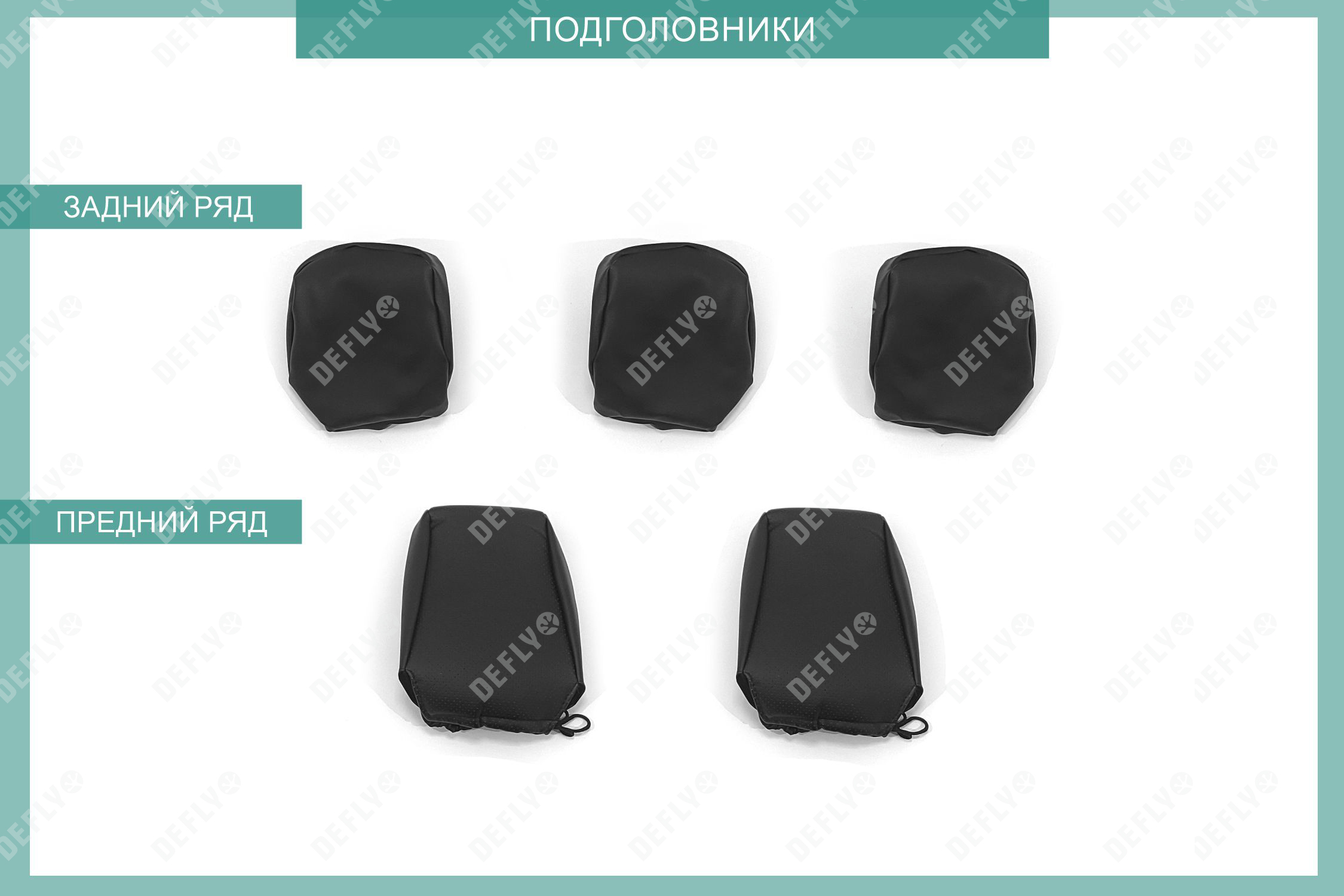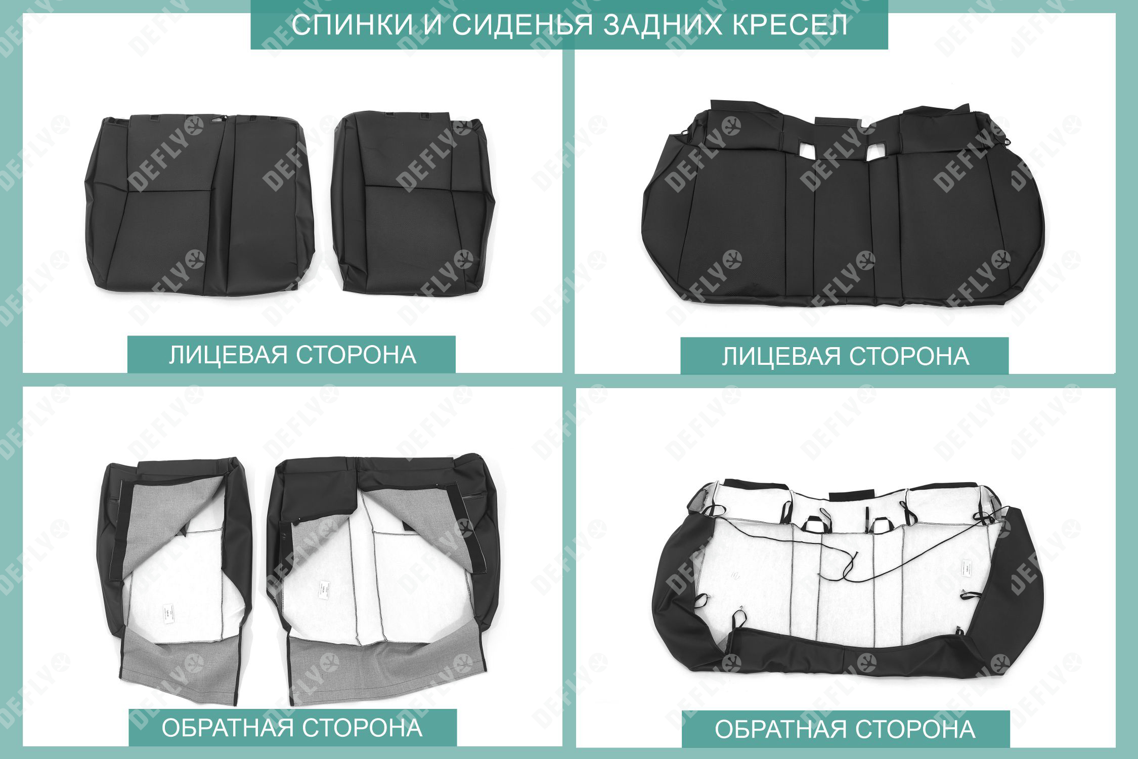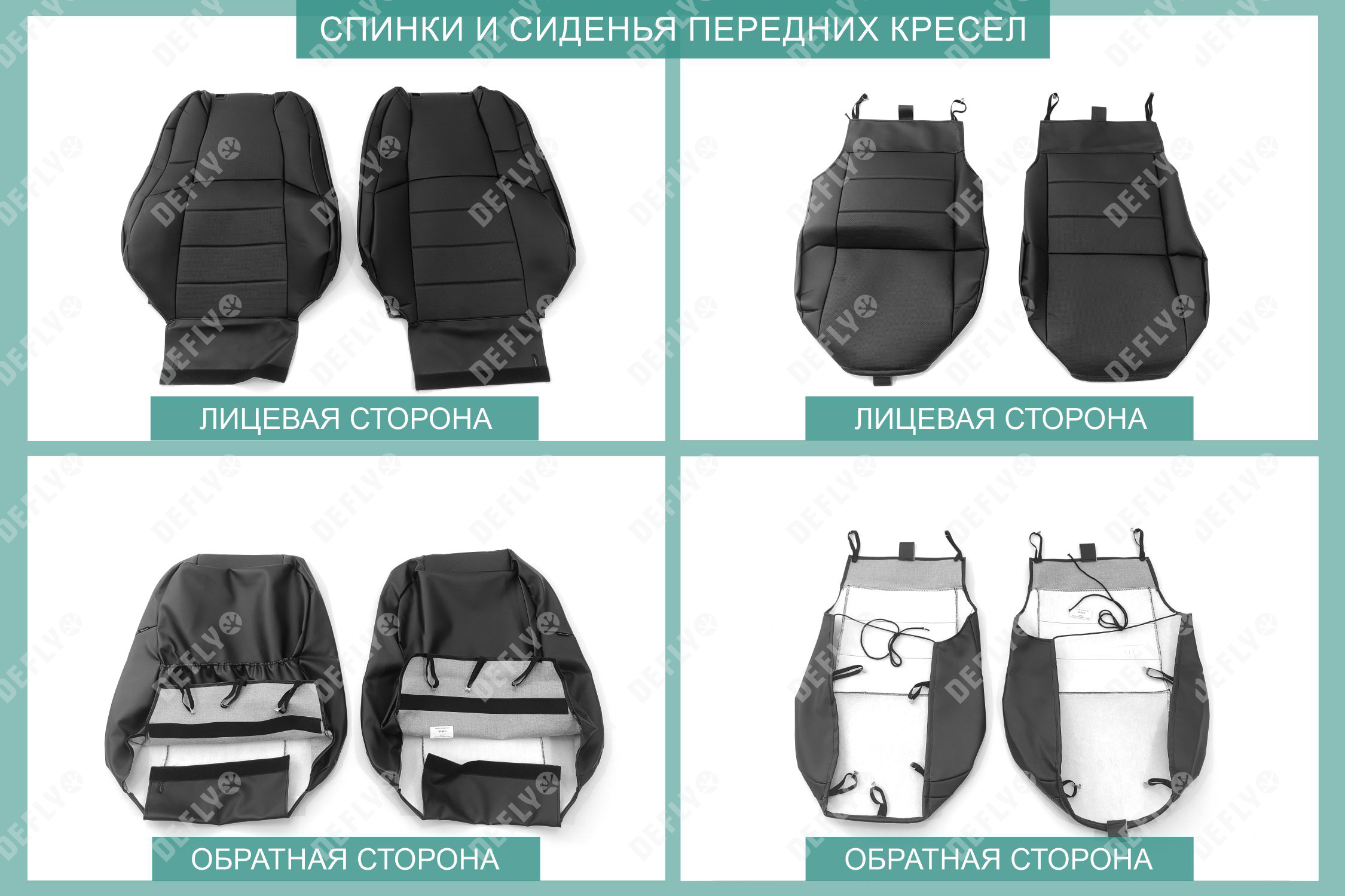 Материал: Экокожа гладкая, экокожа перфорированная, Цвет: Черный (оттенок ткани может незначительно отличаться). Модельные чехлы от производителя “Defly” индивидуально сконструированы для каждого автомобиля. Изготовленные по лекалам оригинальных кресел, чехлы гарантируют идеальную посадку. В комплектацию входят детали всех элементов салона: передних кресел, заднего дивана, третьего ряда сидений, подголовников, подлокотников и т.д. Спинки передних кресел дополнены карманами. Все швы и технологические отверстия обработаны на оверлоке. Чехлы не ограничивают заводскую функциональность салона. Наличие в чехлах специального распускаемого шва не препятствует своевременному и полному раскрытию подушек безопасности. Специально разработанная система креплений позволяет надежно зафиксировать изделия. Авточехлы изготовлены из двух видов экокожи черного цвета: гладкой и перфорированной. Перфорированная экокожа используется в центральных элементах, что обеспечивает циркуляцию воздуха. * Представленные фотографии являются примером исполнения и служат для демонстрации материалов и конструкции чехлов.
