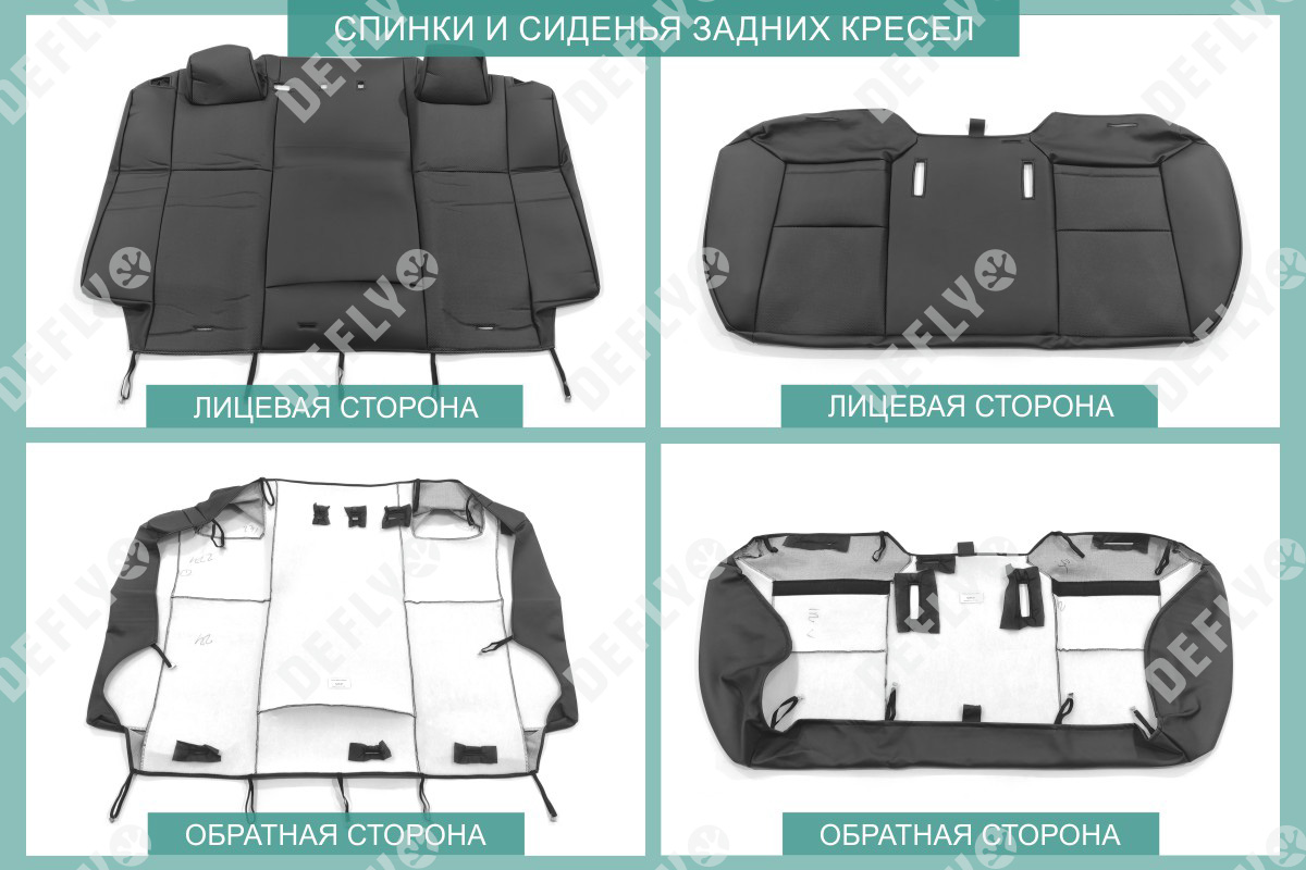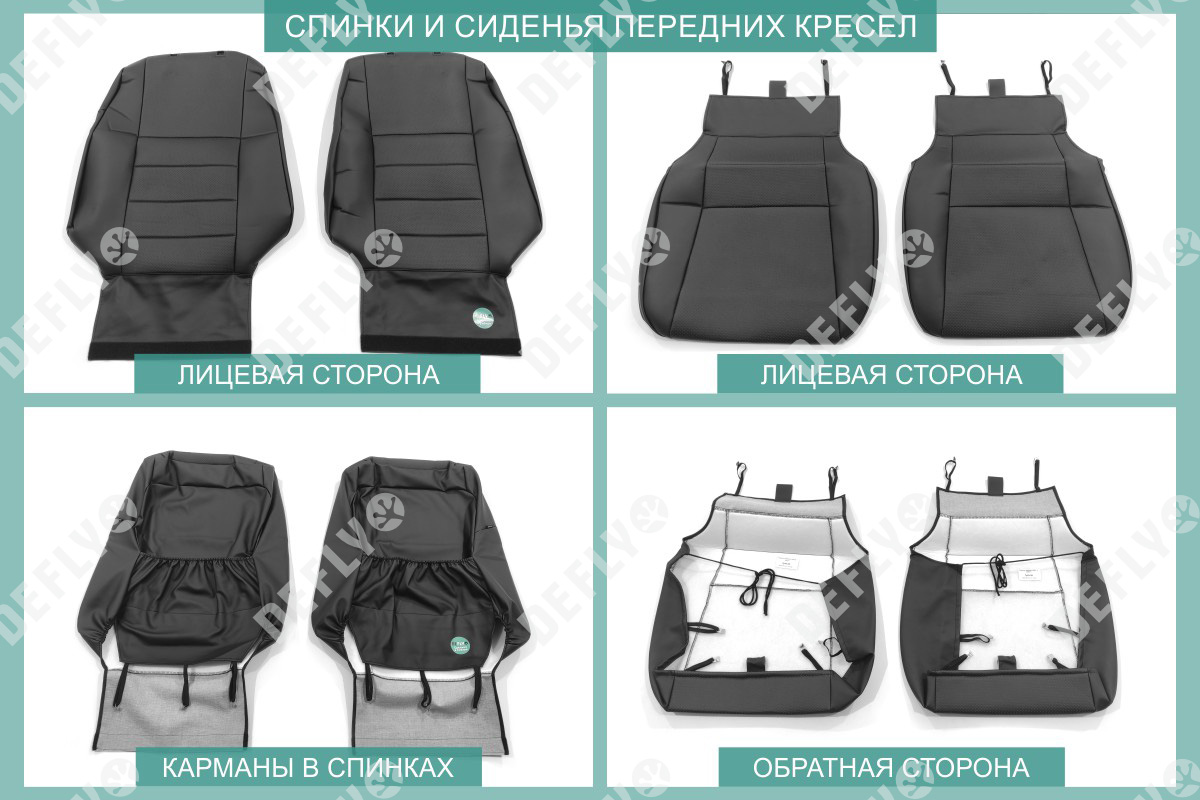 Материал: Экокожа гладкая, экокожа перфорированная, Цвет: Черный (оттенок ткани может незначительно отличаться). Модельные чехлы от производителя “Defly” индивидуально сконструированы для каждого автомобиля. Изготовленные по лекалам оригинальных кресел, чехлы гарантируют идеальную посадку. В комплектацию входят детали всех элементов салона: передних кресел, заднего дивана, третьего ряда сидений, подголовников, подлокотников и т.д. Спинки передних кресел дополнены карманами. Все швы и технологические отверстия обработаны на оверлоке. Чехлы не ограничивают заводскую функциональность салона. Наличие в чехлах специального распускаемого шва не препятствует своевременному и полному раскрытию подушек безопасности. Специально разработанная система креплений позволяет надежно зафиксировать изделия. Авточехлы изготовлены из двух видов экокожи черного цвета: гладкой и перфорированной. Перфорированная экокожа используется в центральных элементах, что обеспечивает циркуляцию воздуха. * Представленные фотографии являются примером исполнения и служат для демонстрации материалов и конструкции чехлов.