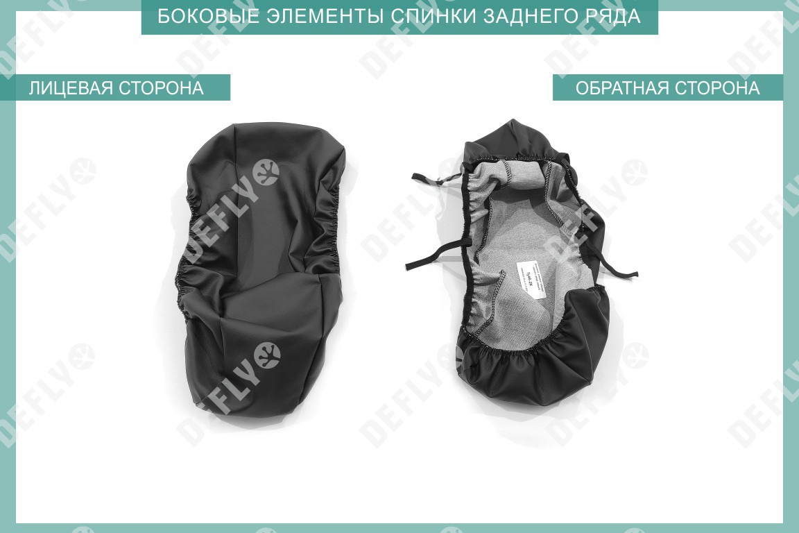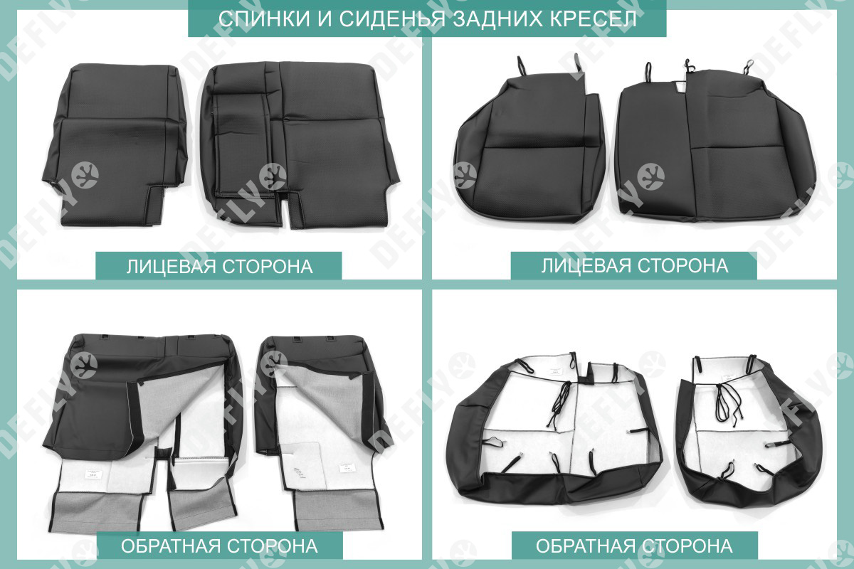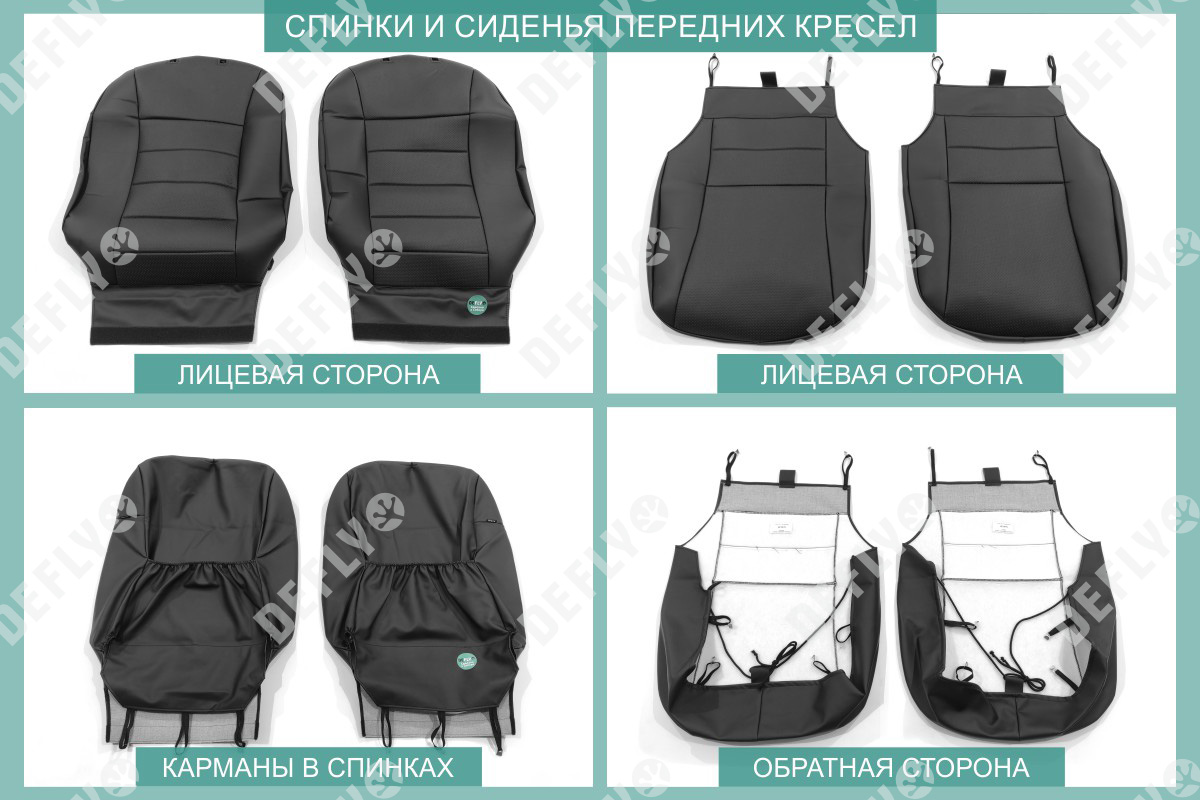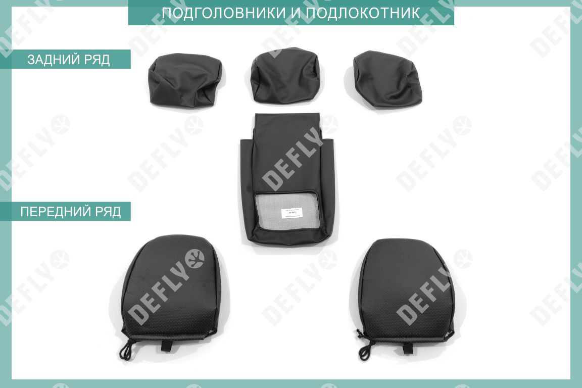 Материал: Экокожа гладкая, экокожа перфорированная, Цвет: Черный (оттенок ткани может незначительно отличаться). Модельные чехлы от производителя “Defly” индивидуально сконструированы для каждого автомобиля. Изготовленные по лекалам оригинальных кресел, чехлы гарантируют идеальную посадку. В комплектацию входят детали всех элементов салона: передних кресел, заднего дивана, третьего ряда сидений, подголовников, подлокотников и т.д. Спинки передних кресел дополнены карманами. Все швы и технологические отверстия обработаны на оверлоке. Чехлы не ограничивают заводскую функциональность салона. Наличие в чехлах специального распускаемого шва не препятствует своевременному и полному раскрытию подушек безопасности. Специально разработанная система креплений позволяет надежно зафиксировать изделия. Авточехлы изготовлены из двух видов экокожи черного цвета: гладкой и перфорированной. Перфорированная экокожа используется в центральных элементах, что обеспечивает циркуляцию воздуха. * Представленные фотографии являются примером исполнения и служат для демонстрации материалов и конструкции чехлов.