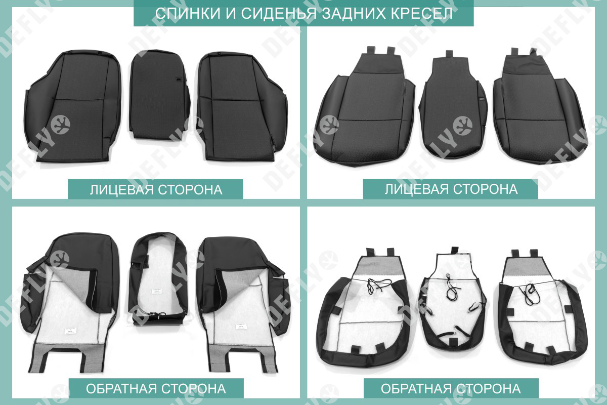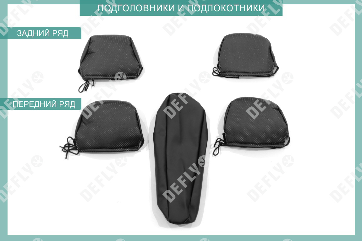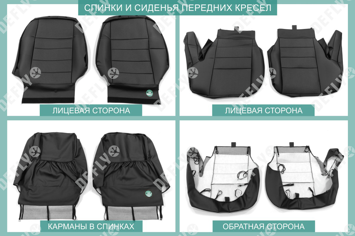 Материал: Экокожа гладкая, экокожа перфорированная, Цвет: Черный (оттенок ткани может незначительно отличаться). Модельные чехлы от производителя “Defly” индивидуально сконструированы для каждого автомобиля. Изготовленные по лекалам оригинальных кресел, чехлы гарантируют идеальную посадку. В комплектацию входят детали всех элементов салона: передних кресел, заднего дивана, третьего ряда сидений, подголовников, подлокотников и т.д. Спинки передних кресел дополнены карманами. Все швы и технологические отверстия обработаны на оверлоке. Чехлы не ограничивают заводскую функциональность салона. Наличие в чехлах специального распускаемого шва не препятствует своевременному и полному раскрытию подушек безопасности. Специально разработанная система креплений позволяет надежно зафиксировать изделия. Авточехлы изготовлены из двух видов экокожи черного цвета: гладкой и перфорированной. Перфорированная экокожа используется в центральных элементах, что обеспечивает циркуляцию воздуха. * Представленные фотографии являются примером исполнения и служат для демонстрации материалов и конструкции чехлов.