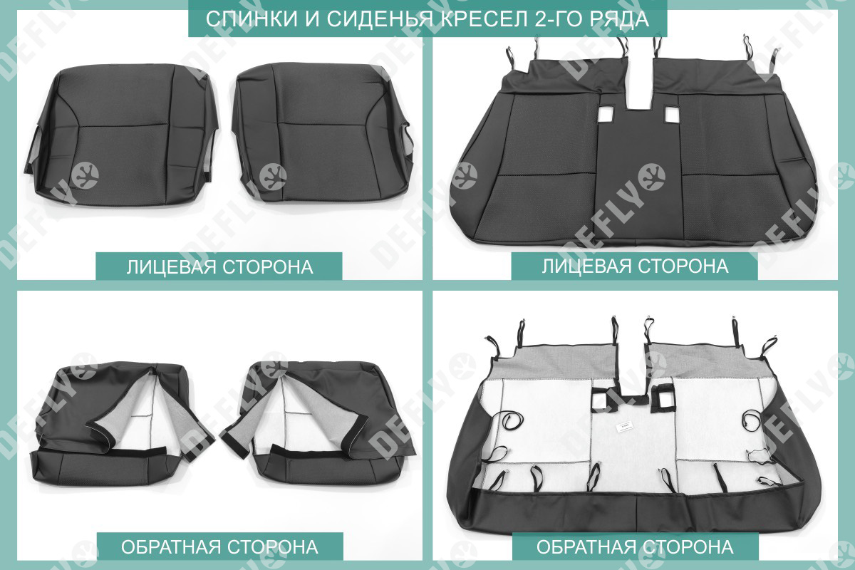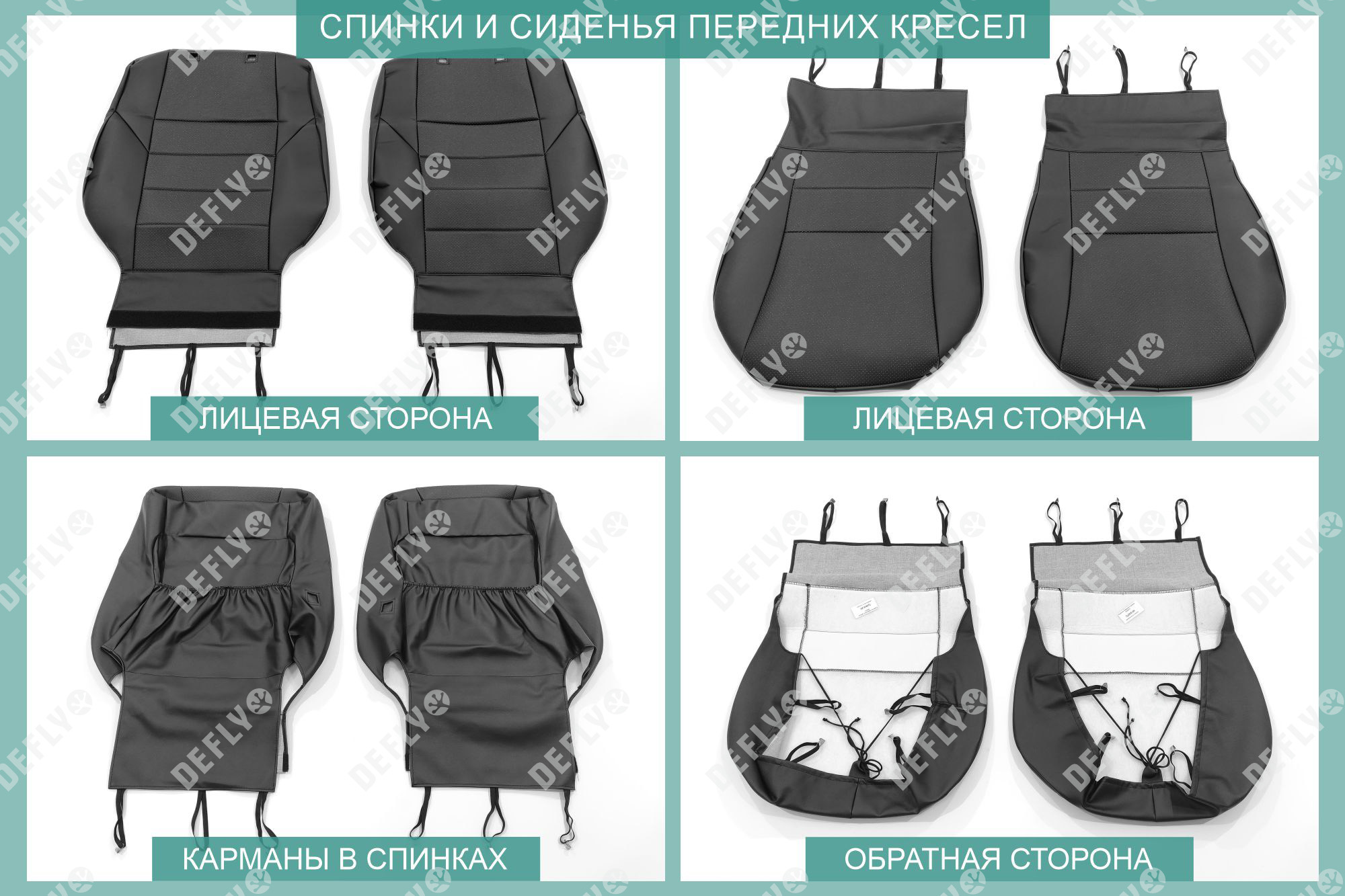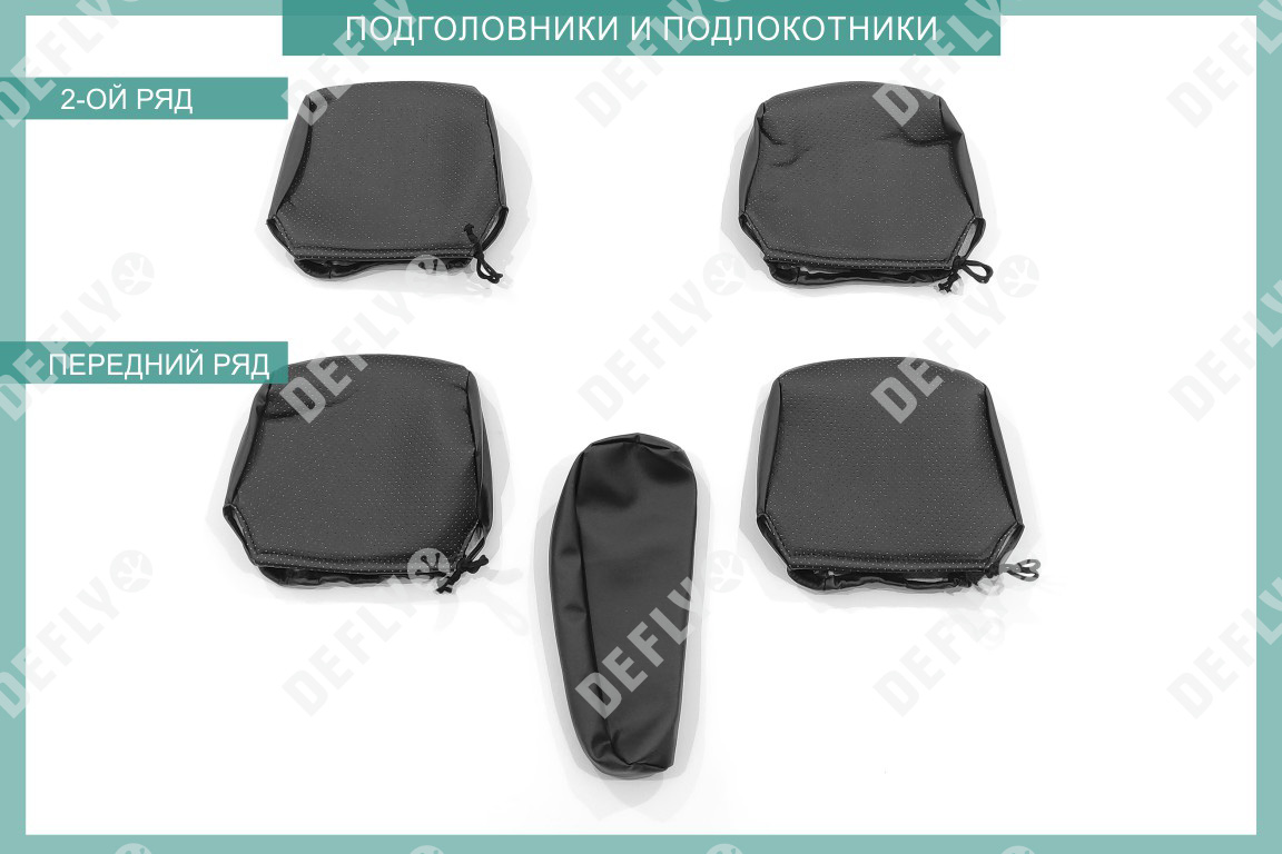 Материал: Экокожа гладкая, экокожа перфорированная, Цвет: Черный (оттенок ткани может незначительно отличаться). Модельные чехлы от производителя “Defly” индивидуально сконструированы для каждого автомобиля. Изготовленные по лекалам оригинальных кресел, чехлы гарантируют идеальную посадку. В комплектацию входят детали всех элементов салона: передних кресел, заднего дивана, третьего ряда сидений, подголовников, подлокотников и т.д. Спинки передних кресел дополнены карманами. Все швы и технологические отверстия обработаны на оверлоке. Чехлы не ограничивают заводскую функциональность салона. Наличие в чехлах специального распускаемого шва не препятствует своевременному и полному раскрытию подушек безопасности. Специально разработанная система креплений позволяет надежно зафиксировать изделия. Авточехлы изготовлены из двух видов экокожи черного цвета: гладкой и перфорированной. Перфорированная экокожа используется в центральных элементах, что обеспечивает циркуляцию воздуха. * Представленные фотографии являются примером исполнения и служат для демонстрации материалов и конструкции чехлов.