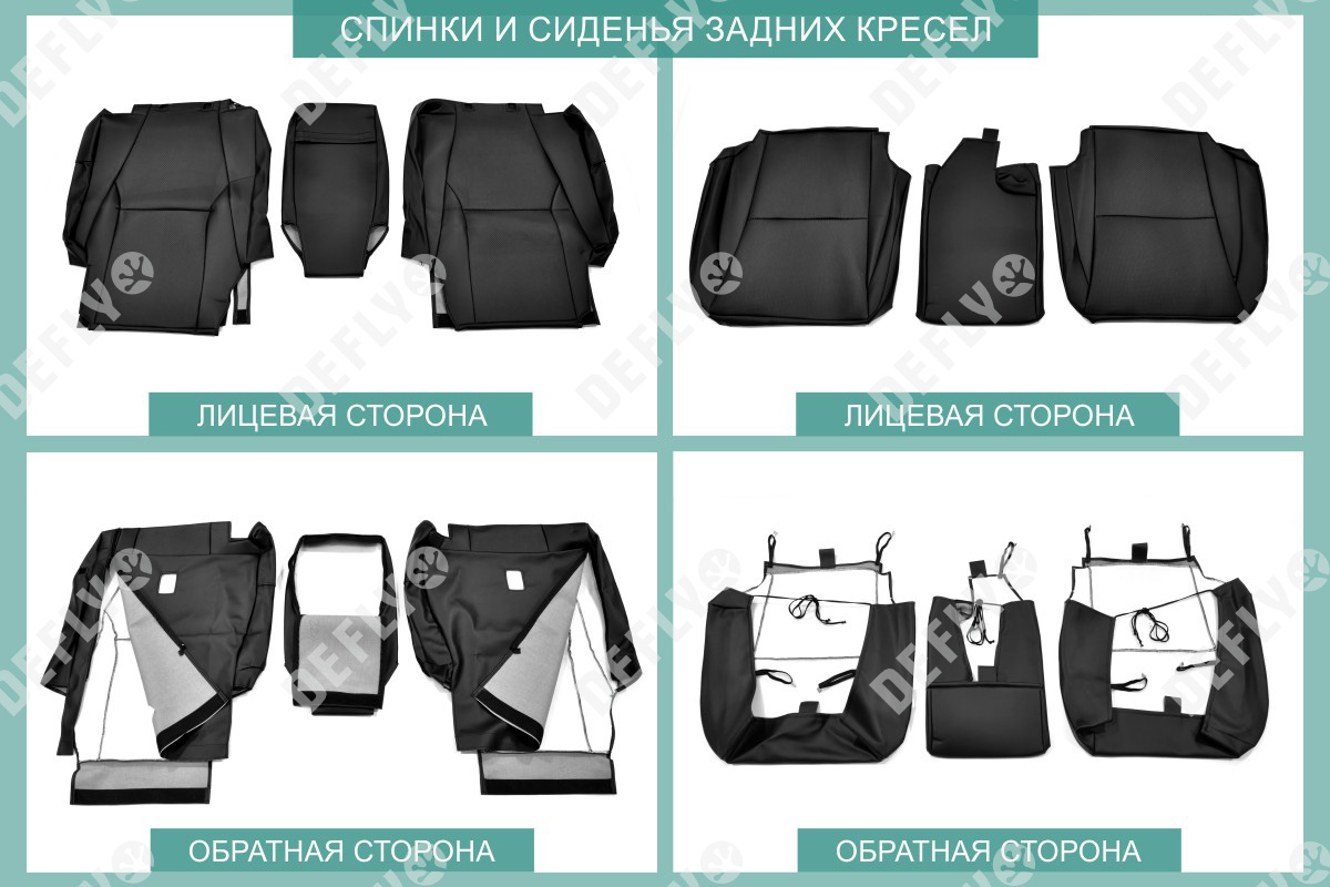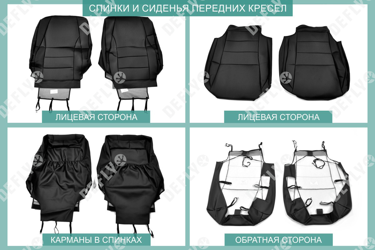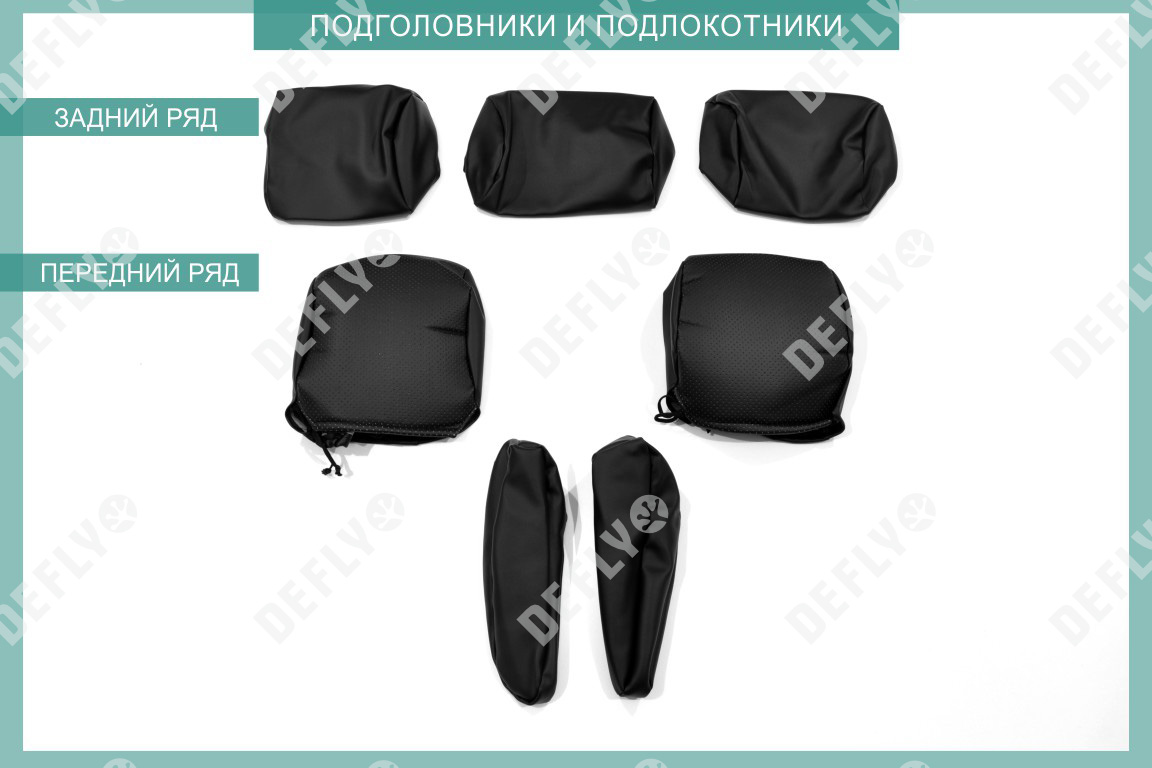Материал: Экокожа гладкая, экокожа перфорированная, Цвет: Черный (оттенок ткани может незначительно отличаться). Модельные чехлы от производителя “Defly” индивидуально сконструированы для каждого автомобиля. Изготовленные по лекалам оригинальных кресел, чехлы гарантируют идеальную посадку. В комплектацию входят детали всех элементов салона: передних кресел, заднего дивана, третьего ряда сидений, подголовников, подлокотников и т.д. Спинки передних кресел дополнены карманами. Все швы и технологические отверстия обработаны на оверлоке. Чехлы не ограничивают заводскую функциональность салона. Наличие в чехлах специального распускаемого шва не препятствует своевременному и полному раскрытию подушек безопасности. Специально разработанная система креплений позволяет надежно зафиксировать изделия. Авточехлы изготовлены из двух видов экокожи черного цвета: гладкой и перфорированной. Перфорированная экокожа используется в центральных элементах, что обеспечивает циркуляцию воздуха. * Представленные фотографии являются примером исполнения и служат для демонстрации материалов и конструкции чехлов.