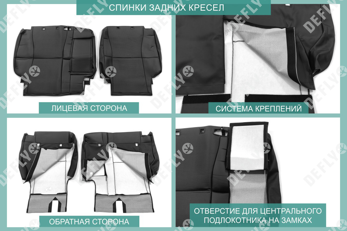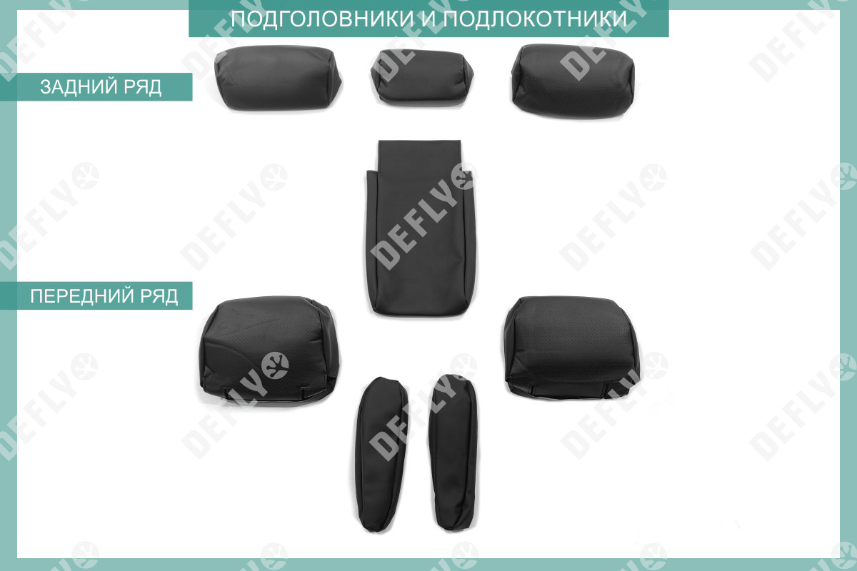 Материал: Экокожа гладкая, экокожа перфорированная, Цвет: Черный (оттенок ткани может незначительно отличаться). Модельные чехлы от производителя “Defly” индивидуально сконструированы для каждого автомобиля. Изготовленные по лекалам оригинальных кресел, чехлы гарантируют идеальную посадку. В комплектацию входят детали всех элементов салона: передних кресел, заднего дивана, третьего ряда сидений, подголовников, подлокотников и т.д. Спинки передних кресел дополнены карманами. Все швы и технологические отверстия обработаны на оверлоке. Чехлы не ограничивают заводскую функциональность салона. Наличие в чехлах специального распускаемого шва не препятствует своевременному и полному раскрытию подушек безопасности. Специально разработанная система креплений позволяет надежно зафиксировать изделия. Авточехлы изготовлены из двух видов экокожи черного цвета: гладкой и перфорированной. Перфорированная экокожа используется в центральных элементах, что обеспечивает циркуляцию воздуха. * Представленные фотографии являются примером исполнения и служат для демонстрации материалов и конструкции чехлов.