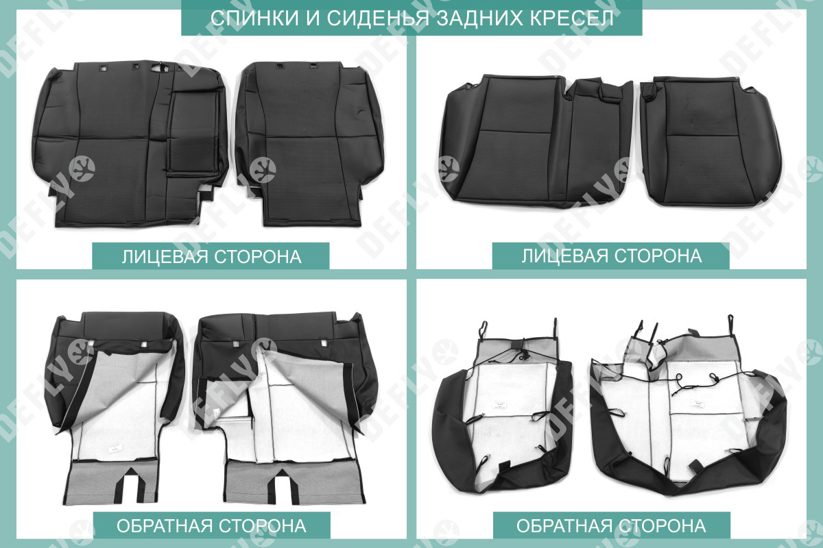 Материал: Экокожа гладкая, экокожа перфорированная, Цвет: Черный (оттенок ткани может незначительно отличаться). Модельные чехлы от производителя “Defly” индивидуально сконструированы для каждого автомобиля. Изготовленные по лекалам оригинальных кресел, чехлы гарантируют идеальную посадку. В комплектацию входят детали всех элементов салона: передних кресел, заднего дивана, третьего ряда сидений, подголовников, подлокотников и т.д. Спинки передних кресел дополнены карманами. Все швы и технологические отверстия обработаны на оверлоке. Чехлы не ограничивают заводскую функциональность салона. Наличие в чехлах специального распускаемого шва не препятствует своевременному и полному раскрытию подушек безопасности. Специально разработанная система креплений позволяет надежно зафиксировать изделия. Авточехлы изготовлены из двух видов экокожи черного цвета: гладкой и перфорированной. Перфорированная экокожа используется в центральных элементах, что обеспечивает циркуляцию воздуха. * Представленные фотографии являются примером исполнения и служат для демонстрации материалов и конструкции чехлов.