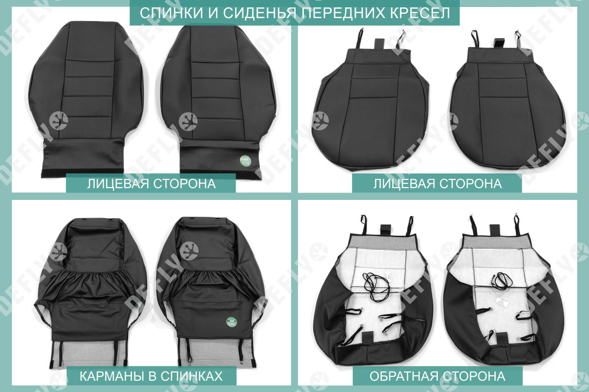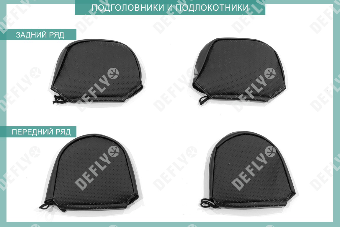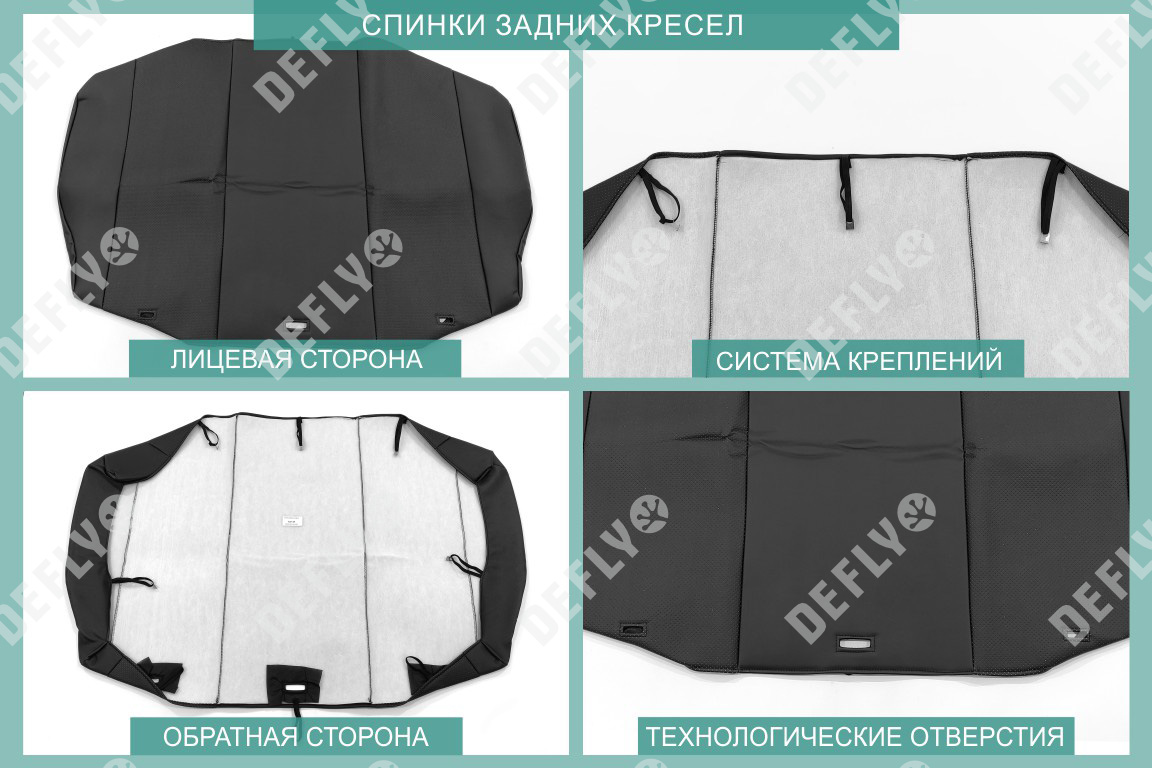 Материал: Экокожа гладкая, экокожа перфорированная, Цвет: Черный (оттенок ткани может незначительно отличаться). Модельные чехлы от производителя “Defly” индивидуально сконструированы для каждого автомобиля. Изготовленные по лекалам оригинальных кресел, чехлы гарантируют идеальную посадку. В комплектацию входят детали всех элементов салона: передних кресел, заднего дивана, третьего ряда сидений, подголовников, подлокотников и т.д. Спинки передних кресел дополнены карманами. Все швы и технологические отверстия обработаны на оверлоке. Чехлы не ограничивают заводскую функциональность салона. Наличие в чехлах специального распускаемого шва не препятствует своевременному и полному раскрытию подушек безопасности. Специально разработанная система креплений позволяет надежно зафиксировать изделия. Авточехлы изготовлены из двух видов экокожи черного цвета: гладкой и перфорированной. Перфорированная экокожа используется в центральных элементах, что обеспечивает циркуляцию воздуха. * Представленные фотографии являются примером исполнения и служат для демонстрации материалов и конструкции чехлов.