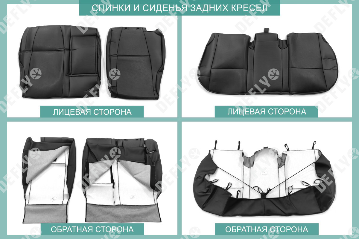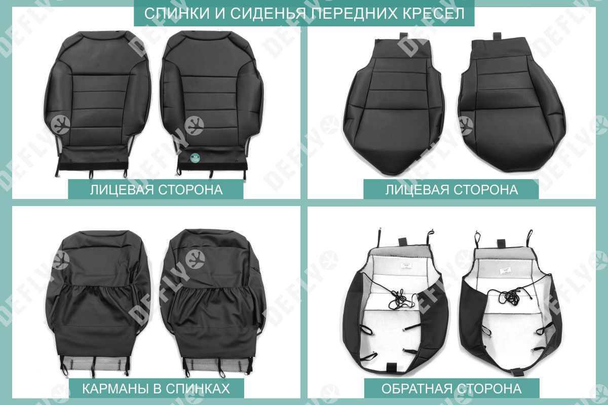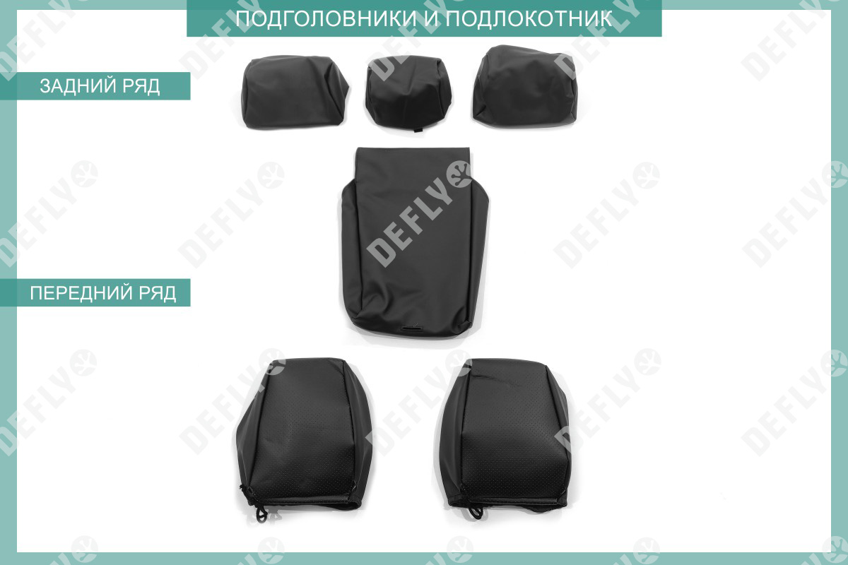 Материал: Экокожа гладкая, экокожа перфорированная, Цвет: Черный (оттенок ткани может незначительно отличаться). Модельные чехлы от производителя “Defly” индивидуально сконструированы для каждого автомобиля. Изготовленные по лекалам оригинальных кресел, чехлы гарантируют идеальную посадку. В комплектацию входят детали всех элементов салона: передних кресел, заднего дивана, третьего ряда сидений, подголовников, подлокотников и т.д. Спинки передних кресел дополнены карманами. Все швы и технологические отверстия обработаны на оверлоке. Чехлы не ограничивают заводскую функциональность салона. Наличие в чехлах специального распускаемого шва не препятствует своевременному и полному раскрытию подушек безопасности. Специально разработанная система креплений позволяет надежно зафиксировать изделия. Авточехлы изготовлены из двух видов экокожи черного цвета: гладкой и перфорированной. Перфорированная экокожа используется в центральных элементах, что обеспечивает циркуляцию воздуха. * Представленные фотографии являются примером исполнения и служат для демонстрации материалов и конструкции чехлов.